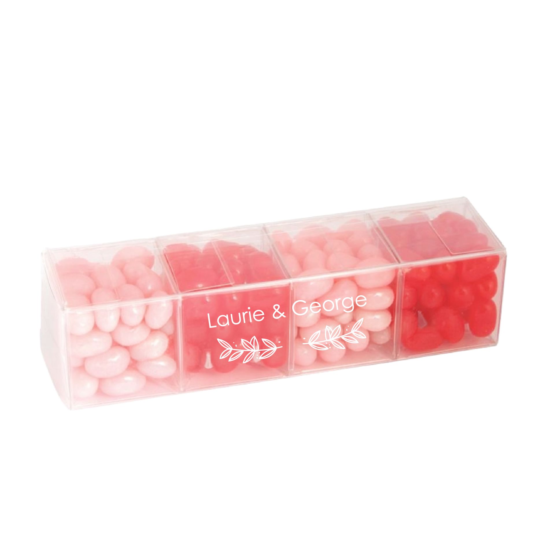 Commande minimum :100 Faites plaisir à vos invités lors de votre prochaine campagne promotionnelle en leur offrant cette jolie boîte en acétate remplie de bonbons gélifiés. Ce sac attrayant mesure 3,8 cm de large x 8,9 cm de long x 10,2 cm de haut et contient 92 g de délicieux bonbons gélifiés aux fruits, de couleurs assorties. Un cadeau idéal pour une inauguration, un événement shopping et bien plus encore ! Personnalisez-le avec l'impression directe en une couleur de votre logo et de votre message pour créer un cadeau gourmand dès aujourd'hui.